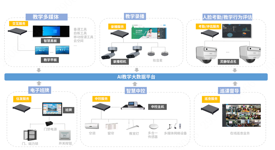 智慧教室解決方案貫穿教、學(xué)、評(píng)、管整體業(yè)務(wù),系統(tǒng)涵蓋教學(xué)多媒體、教學(xué)錄播、課堂點(diǎn)名(人臉無感考勤)、教學(xué)行為評(píng)估、智慧班牌、智慧中控、巡課督導(dǎo)等。